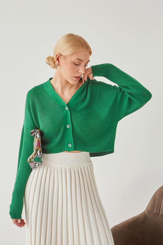 Безпечна оплата Оплата після предоплати 200грн. Укорочений кардиган у розслабленому стилі із натуральної сумішової пряжі з включенням бавовни та віскози. Модель із застібкою на 3 гудзики пов'язана з переплетенням середньої щільності в природних відтінках. Має комфортний силует та спущену плечову лінію. Прекрасно комбінується з вузькими виробами, що сидять по фігурі, зміщуючи зоровий акцент на лінію талії. Довжина виробу зі спіку 43-48 см. 60% - бавовна 40% - ВІСКОЗА Розміри 42-46 46-52 Кольори зелени та чорний