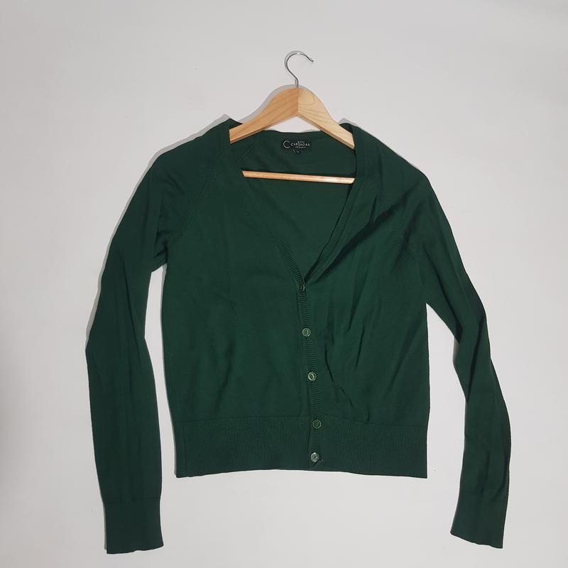 Кардиган зелёного цвета 83% вискозы Размер указан 12 Длина 52 Рукав от горловины 69 ПОГ 46