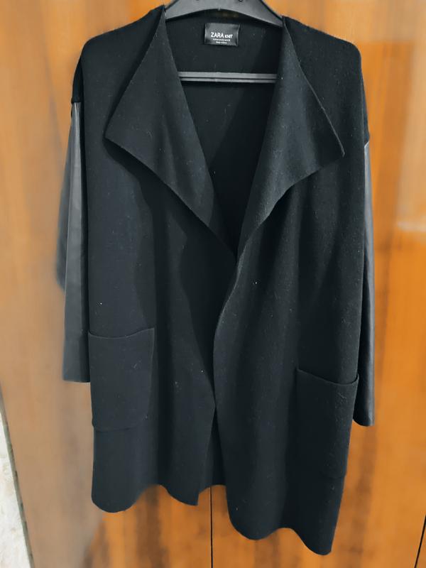 Кардиган со спущенными плечами, рукава из кожзама (экокожа), с накладными карманами.