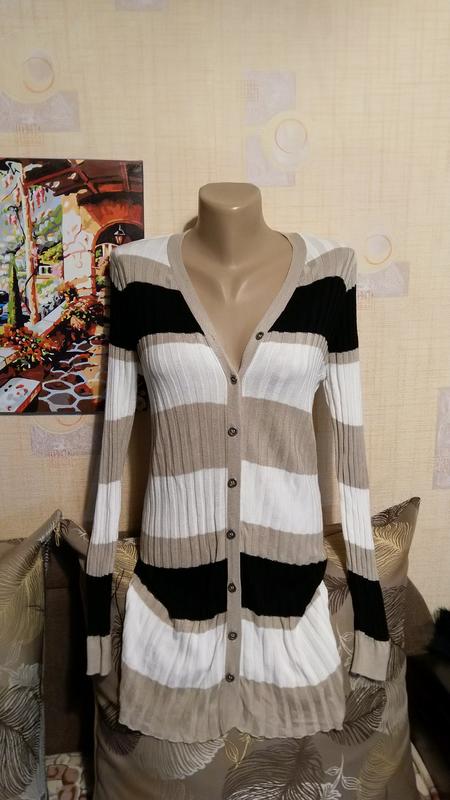 Полосатая удлиненная кофта кардиган. Указан размер М, подойдёт и на С. Манекен размера С. Цвета полосок: белый, бежевый, черный