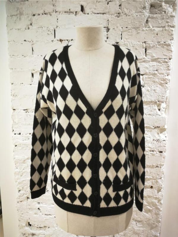 кардиган Lucienne, Italia бело-серые ромбы, на пуговицах, два кармана, 60% вовна, 40% акрил, размер 46, плечи 37см, грудь 49см, бедра 49см, длина 75см, длина рукава 63см