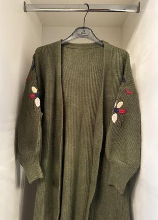 Длинный женский кардиган Новый Включает карманы Насыщенный хаки Размер М Без застежек Имеет выбитые цветы