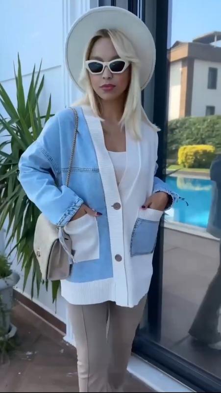 Кардиган кроя оверсайз из мягкой смеси с вставками джинсовой тканы. Изделие со свободным кроем дополнено V-образным вырезом, подчеркивающим область декольте. • Размер универсальный • Цена 1850грн 23107 (очекуем проф фото)