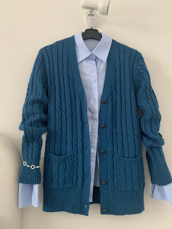 Теплий жіночий кардиган, смарагдовий на ґудзиках , р.S, виробництво Туреччина. 80% акрилік ( матеріал візуально і тактильно подібний до вовни, але міцніший і легший у догляді ), 20 % поліамід текстура з легким ворсом, вʼязка коси. Довжина -65 см Ог- 90 см (підійде і на більший обхват, так як гарно тягнеться
