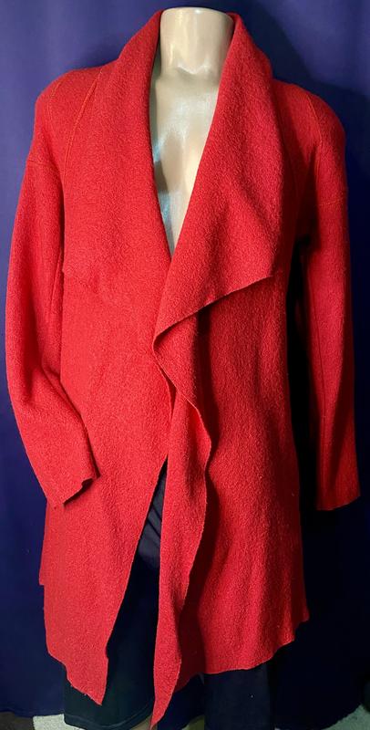 Кардиган на запах з напів вовни. Яркий червоний колір. Без застібок. Заміри: Довжина виробу 90 см Напів обхват грудей 57 см Довжина рукава 65 см
