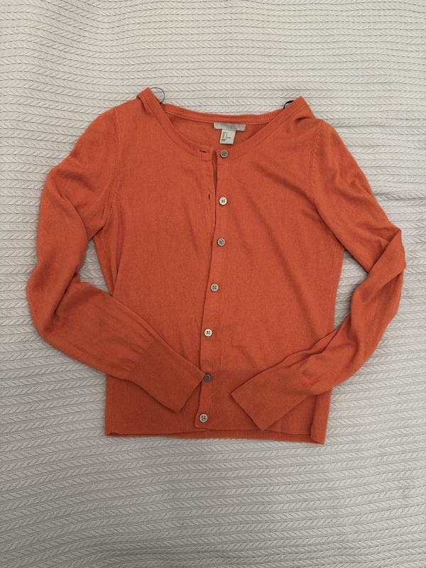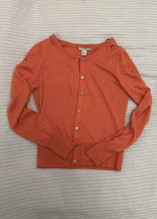 Кардиган гарного осіннього кольору, склад повністю натуральний 80% віскоза, 20% ангора. На бірці розмір s, але гарно сідає на xs. Заміри: ширина в плечах 36 см, довжина по спинці 50 см, довжина рукава 61 см.