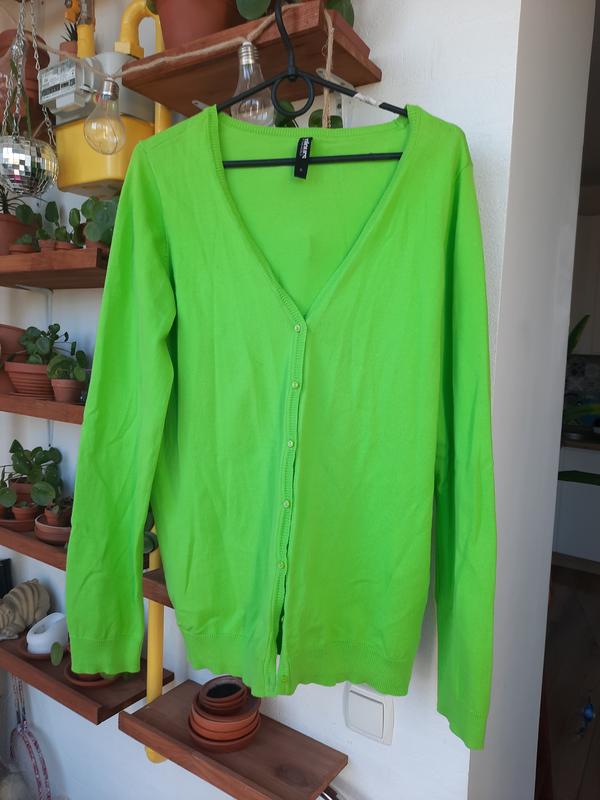 Яркий зеленый кардиган размер XL Длина изделия 70 см ПОг 51 см в свободном состоянии ПОТ 50 см тянется запасная пуговица цвет не такой неоновый. ярко салатовый