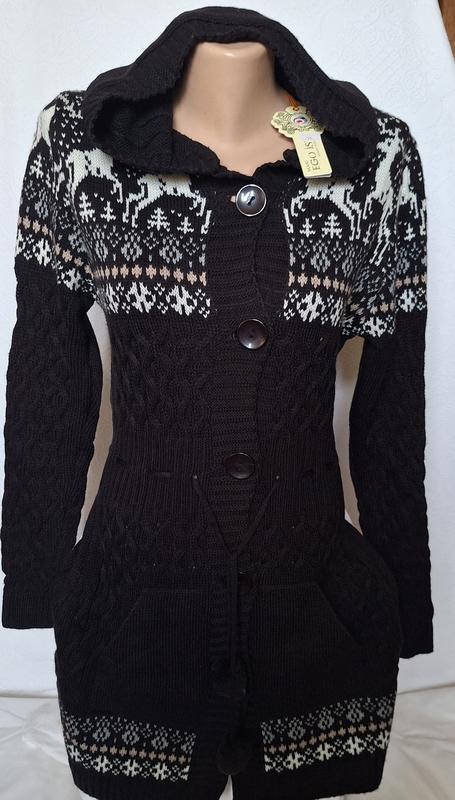 Очень симпатичный кордиган с капюшоном. ПОГ 46см, длина по спинке 80см, длина рукава 63 см. Состав на фото 4.Цвет черный.