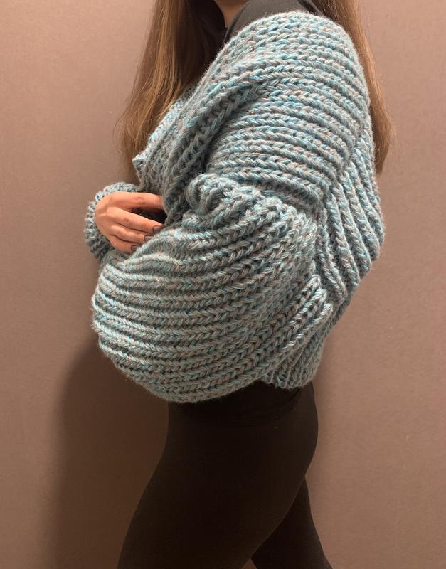 Вязаный мини-карди ручной работы. Оверсайз, будет на размер S и М. Нитка - вовна/акрил Цвет серый/бирюза