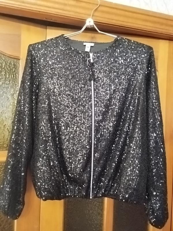 Модный женский бомбер с пайетками. Очень стильный и красивый. Новый. размер 52-54. Длина от ворота по спине -60 см.