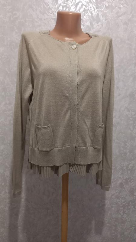 кардиган итальянского премиального бренда, состояние идеальное. Бирки со складом нет, на ощущение трикотаж - это шерсть, плиссе - полиэстер. Размер 48