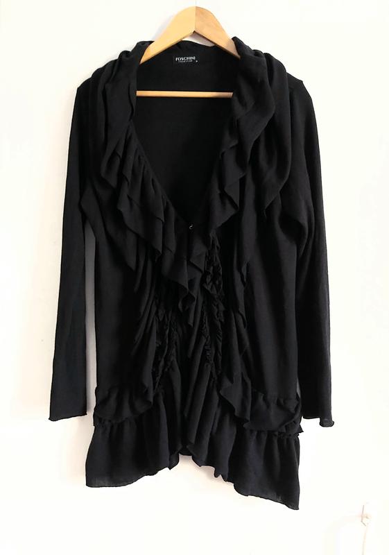 Женский кардиган трикотаж с рюшами, длинным рукавом. Тканина тягнеться Замеры: Ширина плечей 38 см Ширина груди 50 см длина рукава 61 см длина изделия 76 см