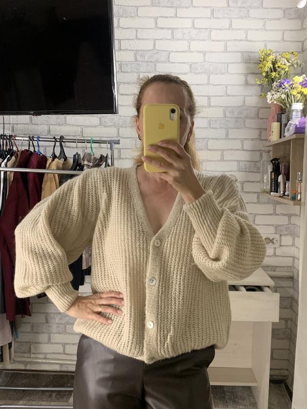 Ніжний кардиган, мякенький, зручний, на не надто чутливу шкіру буде ідеальний, мені чуть-чуть лоскоче шкіру) 30% кід мохеру, 10% вовни, поліамід і поліестер Розмір M-XL Плечі 37, по грудях 58, внизу 57, рукав 64, довжина 55 см