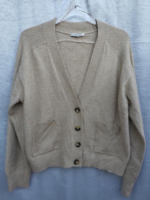 Известного бренда, кофта или короткий кардиган, как хотите.На застежке, имеет карманы,V образный вырез.Рукава широкие, манжеты. Очень теплый и стильный.Стан новой вещи, но без ярлыка. П о.г.-64 длина рукава - 59 ширина плечей - 58 п.об.низу- 55-60 длина - 57.