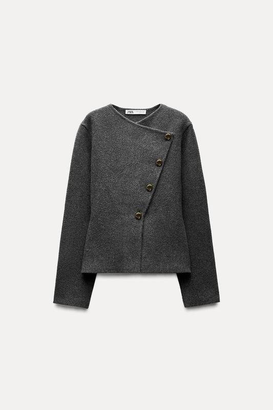 Цена 1980 Жакет с круглой горловиной и длинными рукавами. Поперечная застежка спереди на кнопки. Серый <unk> 4192/137