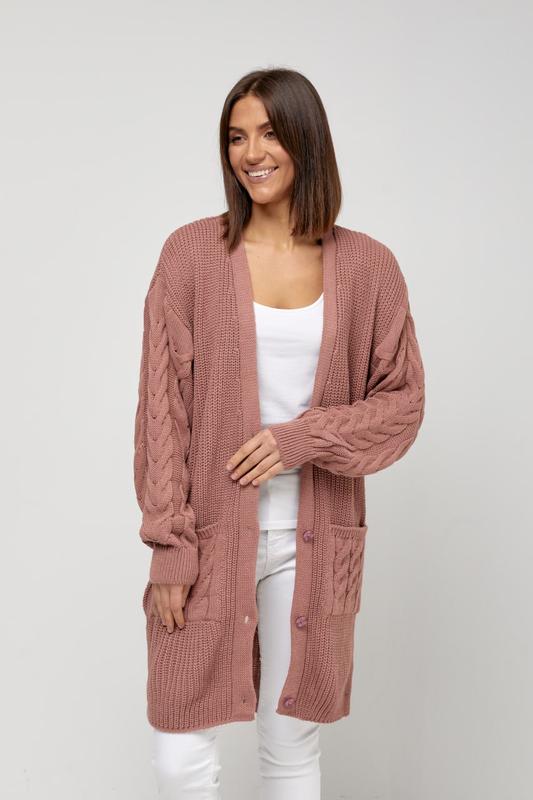Кардиган женский вязаный шерстяной удлиненный, фабричный, однотонный, розовый