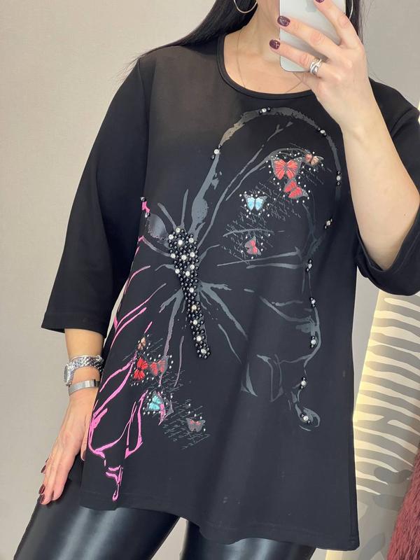 казково красива кофточка вільного силуету з круглим вирізом і рукавами трохи нижче ліктя з першої хвилини потрапляє в наші серця і гардероби, вона відмінно підійде для роботи і свят кофточка виконана з високоякісного трикотажу приємного на дотик з неймовірно красивою аплікацією з пришитих страз ідеальний крій добре виглядатиме на дівчатах з різними типами фігур, а шикарна якість не залишить байдужою жодну цінительку гарного одягу розміри 52 54 56 56 58 60 залежно від розміру довжина 73-76 см, об'єм грудей по виробу від 120 до 134 см, об'єм стегон по виробу від 132 см до 150 см, довжина рукава від шиї 54-57 см код FH 48-90