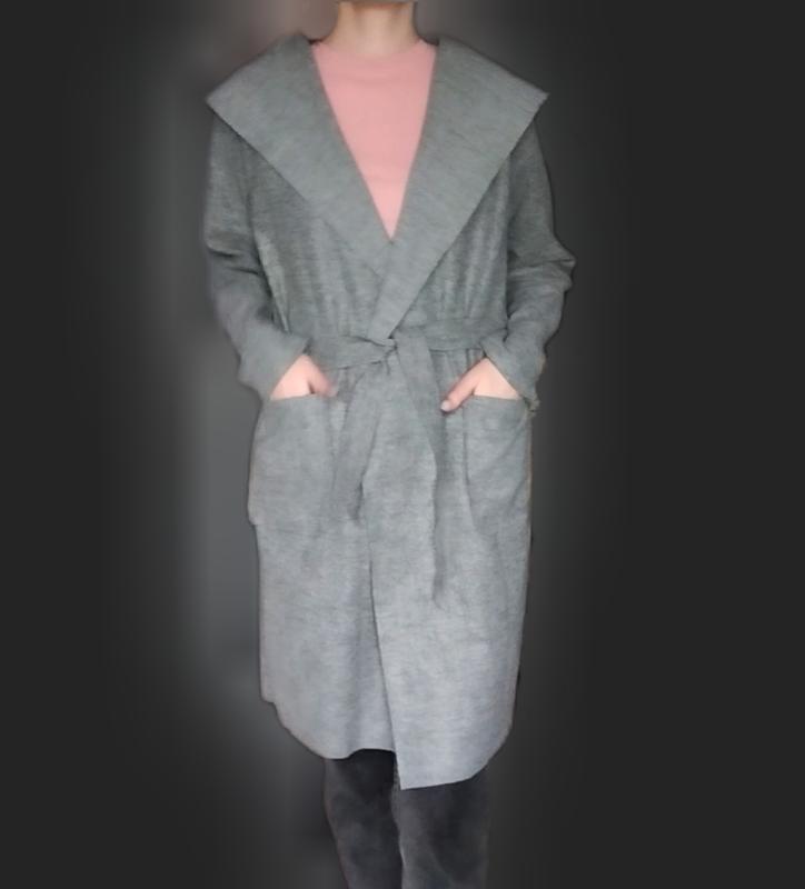Женский кардиган под пальто. С капюшоном, поясом, карманами спереди, без застежек. Ткань плотная но не толстая. Без броков. примерно на размер S-M. При необходимости, сделай замеры. Стан - идеальный