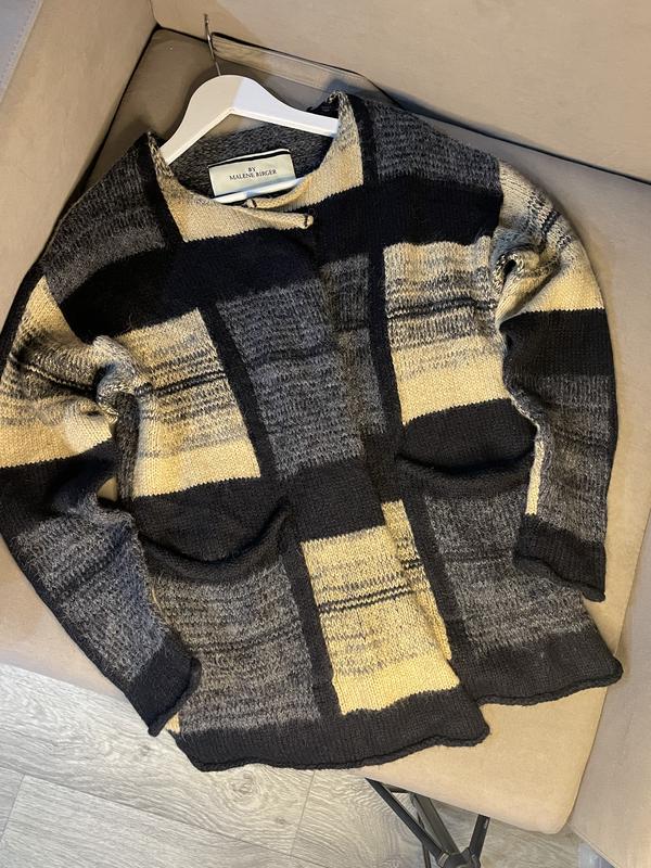 Кардиган в крупную клетку без пуговиц By Malene Birger В составе 30% альпаки 10% шерсти Мягкий приятный к телу Размер S Стан - идеальный Длина 72 см Ширина 53 см Рукав от воротника 75 см