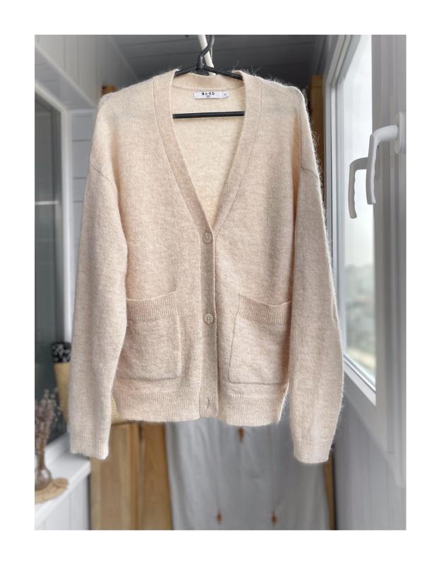 Размер производителя М Замеры: нОг - 54 см длина - 54 см рукав от горловины - 72 см Базовый кардиган актуального кроя Имеет 2 накладных кармана Состав ткани смешанный: 40% полиамид, 29% акрил, 16% альпака, 11% шерсть, 4% эластан Нежный персиковый цвет Без нюансов