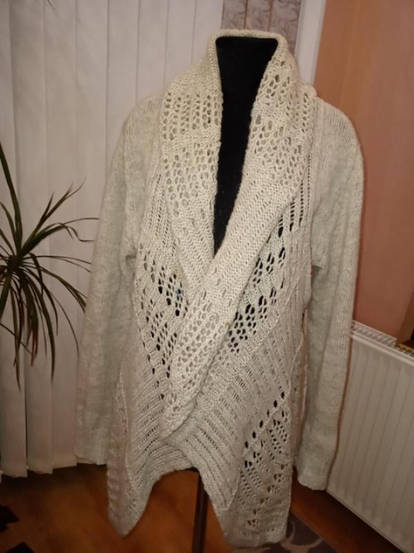 бірок зі складом немає, схоже на смесову пряжу - вовна/акрил, розмір one size від 46 до 54 завдяки особливості фасона, ажурна в'язка вкругову, рукави та спинка - щільна в'язка, без застібки, шикарний комір, дуже теплий та затишний