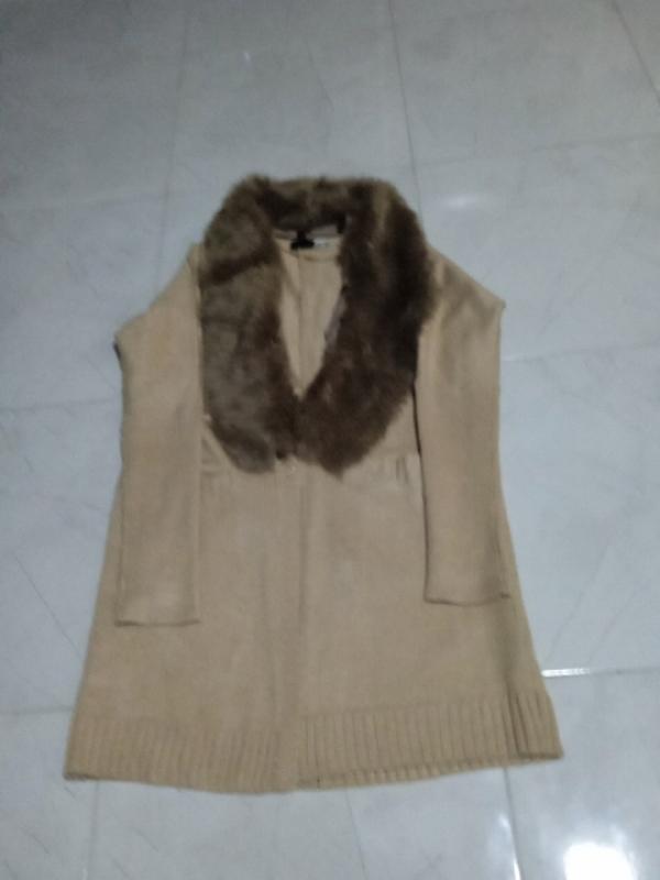 Кардиган бежевого кольору. З двома кишенями. На один Гудзон. Плече опущене.Комір зі штучного хутра. Знімається. Розмір 46-48.