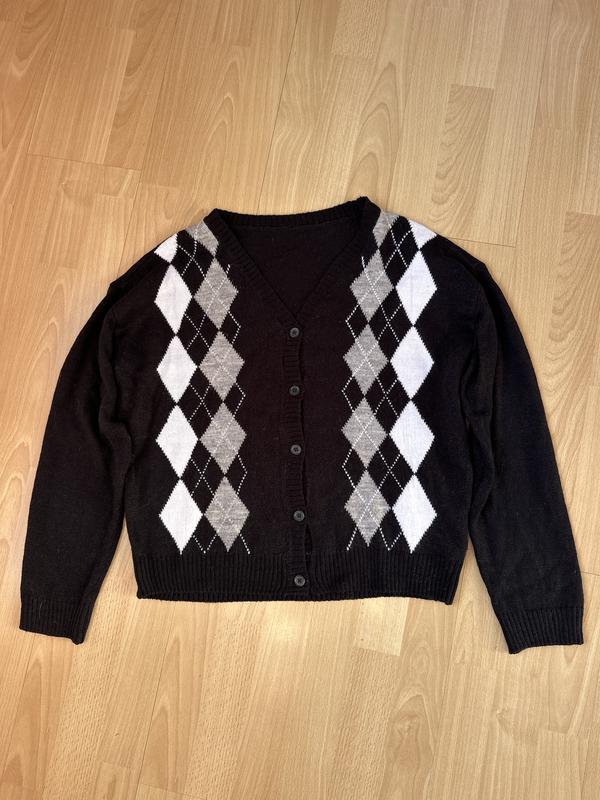 Вязаный кардиган с актуальным принтом Аргайл. Тканина тягнеться. Длина 58 Ширина в груди 58 Рукав от горловины 72