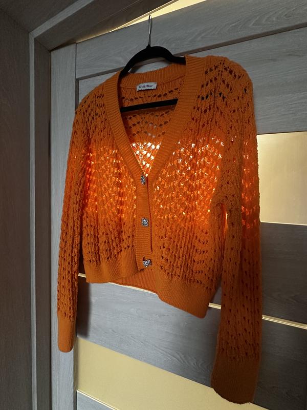 Кардиган яскраво - помаранчевого кольору Размер универсальный Длина- 56 см Рукава - 74 см Груди - 53 см Низ по манжету - 47 см