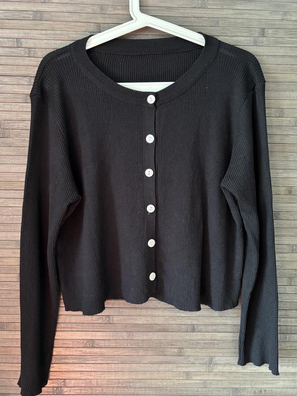 Легкий кардиган трикотаж в рубчик, без броков. Низ необработанный. Очень приятная ткань на ощупь. Фасон свободный. В идеальном состоянии.