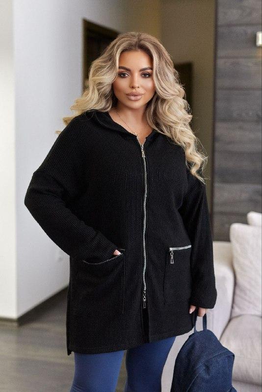 Кофта кардиган Тканина:вязка турецька. Має капюшон. Кишені на блискавках. Кольори як на фото. Розміри:48-52,54-58. Розмірна сітка 48-52: Об'єм грудей 63см Довжина рукова від плеча 40см Довжина виробу по спинці 78 см. 54-58 Об'єм грудей 70см Довжина рукова від плеча 42см Довжина виробу по спинці 81см сар