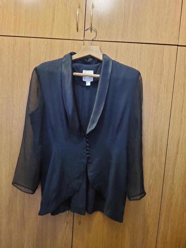 Кардиган женский в красивом состоянии черного цвета рукава из прозрачной ткани воротник атласный спереди на пуговицах 53%вискоза 47%п/е замеры ширина плеча 46 см длина рукава от плеча 56 см пог 55 см длина по спине 70 см