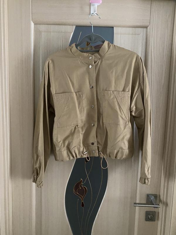Бомбер без подкладки весенний. Застегивается на кнопках. Снизу стягивается затяжками.