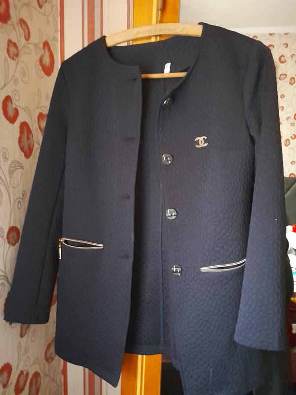 Піджак темно-синього кольору ,буде пасувати до штанів або сукні ,приємна тканина ,не кошлатиться.Стан ідеальний, був одягнений декілька разів .
