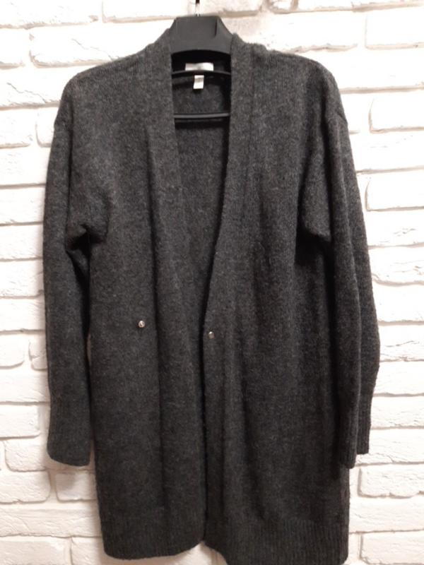 Подовжений кардиган оверсайз фасон H&M. М'який, теплий і легенький. Асиметрична застібка на кнопку. ПоГ 54 см. ПоС до 57. Лінія плеча понижена. Рукав - 55. Довжина по спинці 92 см.