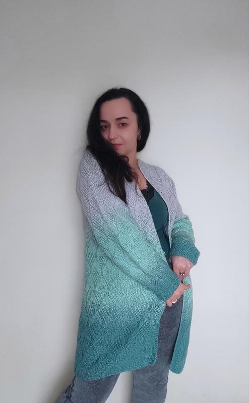Кардиган в'язаний із напівшерсті на 44-46 розмір. Стан ідеальний. Одягала пару раз.