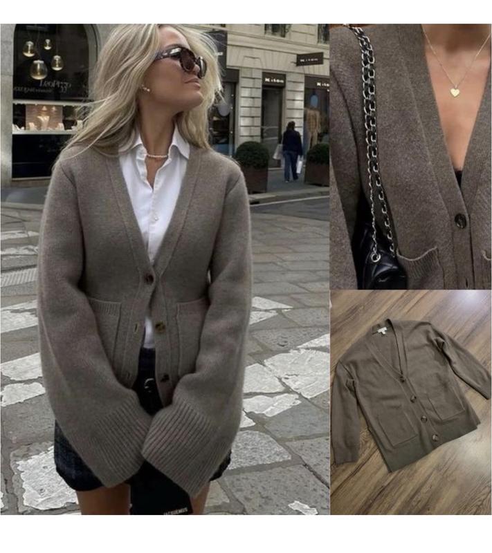Плотный, мягкий кардиган коричнево-серого оттенка. Состояние отличное. Размер указан XXL. Длина 80 Рукав 49 Плечи 71 По груди 75