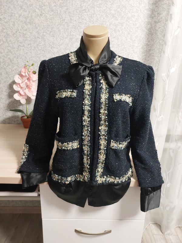 Женский темно синий с золотой нитью и отделкой под твид, жакет в стиле известного бренда, из акрила, полиамида и эластана, размером М. В идеальном состоянии, красиво тянется, застегивается сверху на металлический крючок, есть два накладных кармана. Все замеры на фото, качество отличное. Маде ин Турция.