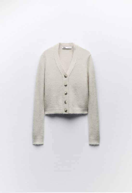 Кардиган із суміші альпаки та фетрової текстури. V-подібний виріз і довгі рукави. Застебнуто спереду. Ребриста обробка. Розмір L