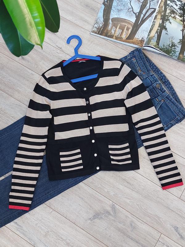 Модель с длинными рукавами, округлым вырезом и застежкой на кнопки, которые брендированы. Два удобных кармана спереди. Контрастные красные детали на манжетах подчеркивают оригинальный дизайн. Идеальный выбор для стильного повседневного образа. Основной состав - вискоза. Состояние новой вещи. На размер S, M Длина: 56 Длина рукав: 62, от подмышек 43 Плечи: 38 ПОГ: 45 ПОТ: 44 Низ: 45