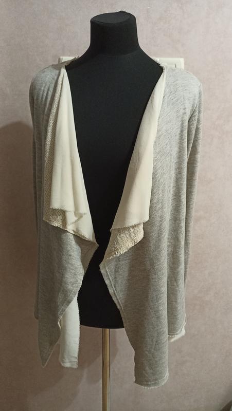 Оригинальный двойной кардиган без застежки. Верх-плотной трикотаж серого цвета, подкладка-шифон молочного цвета. Все края не обработаны. Спинка приталена. Замеры : длина по спинке -62см, длина рукава -72см, пог-48см, к низу свободный.