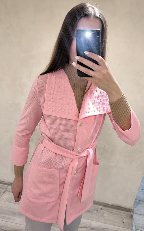 Классный, стильный, качественный кардиган, рукав укороченный, приятная к телу ткань, красиво смотрится на теле, отделан жемчужинами, имеет ремень. Размер S