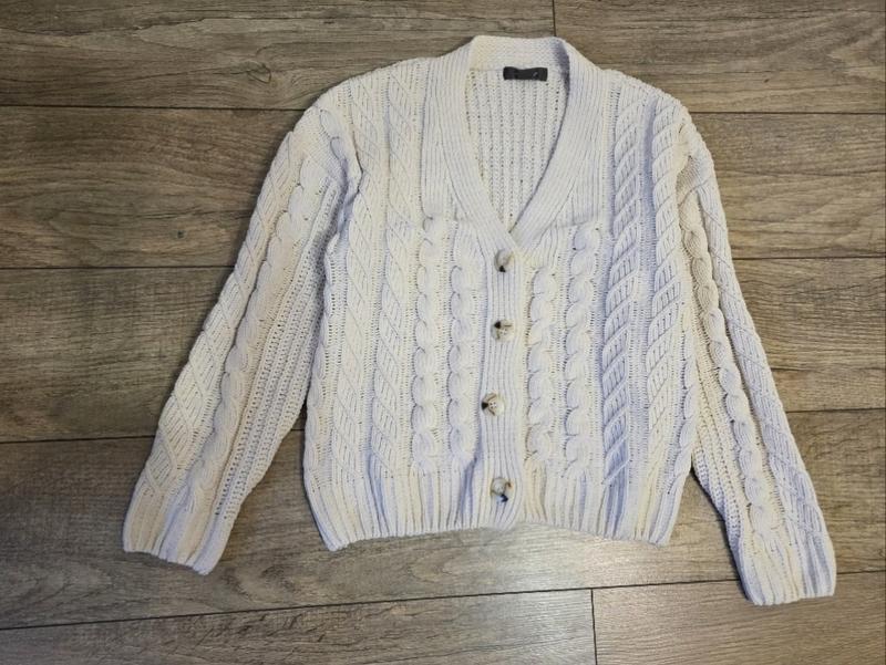 Кардиган на пуговицах, объемный. Молочный цвет. Плюшевая вязка. В идеальном состоянии. Размер XS, может быть и на S, M. Замеры: длина 55см, ширина 50см, длина рукава от шеи 78см. Дополнительные фооо и замеры разрастанию при необходимости.