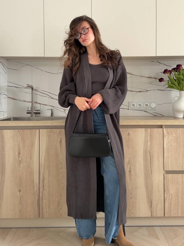 Вязаный кардиган графит длинный без пуговиц люкс качество