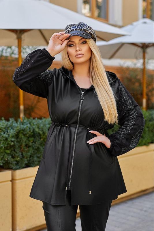 Кардиган " PARADOX" # 968 (ал-коз) Размеры: 48-50, 52-54 , 56-58. Размеры идут спаренные. Тканина: Эко кожа + рукава Двухнитка, декорировано аппликацией и Стразами высокого качества DMS. Фактические измерения: По 52-54 размеру. Длина от плеча: спереди - 90 см. Ззаду - 86 см. Рукава - 65 см. ОГ - 120 см. ОТ - 120 см. ОБ - 130 см. К каждому следующему размеру добавлять + 4см (на одиночные размеры). На спарении +8см, помимо длины изделия. Рост модели на фото- 170см. На модели одет: 52-54 размер. Параметры модели на момент съемки: БЛОНДИНКА: ОГ: 115 см. ОТ: 90 см. ОБ: 120 см. БРЮНЕТКА: Рост 172 см. ОГ: 96 см. ОТ: 88 см. ОБ: 117 см. Дополнительные характеристики: Кардиган: Эко кожа хорошего качества, рукава из Двухнитки, оформленные аппликацией с кожи и стразами высокого качества DMS, хорошо держатся - прошли термо отделку на специальном оборудовании. На талии идет кулиска, регулируется для фиксации фигуры. Рукава на резинке. С капюшоном. С карманами. Сезон осень-весна.. Цвета изделия: Черный. Коричневый.