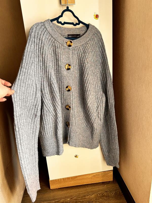 Вязаный кардинал красивого голубого цвета, камера не передает идеально цвет, к сожалению. Замеры: длина рукава от горловины 73 см., длина кардигана 56 см., ПОГ 50 см. Состав: 69% акрил, 29% полиэстер, 2% эластан. Состояние: есть катышки.
