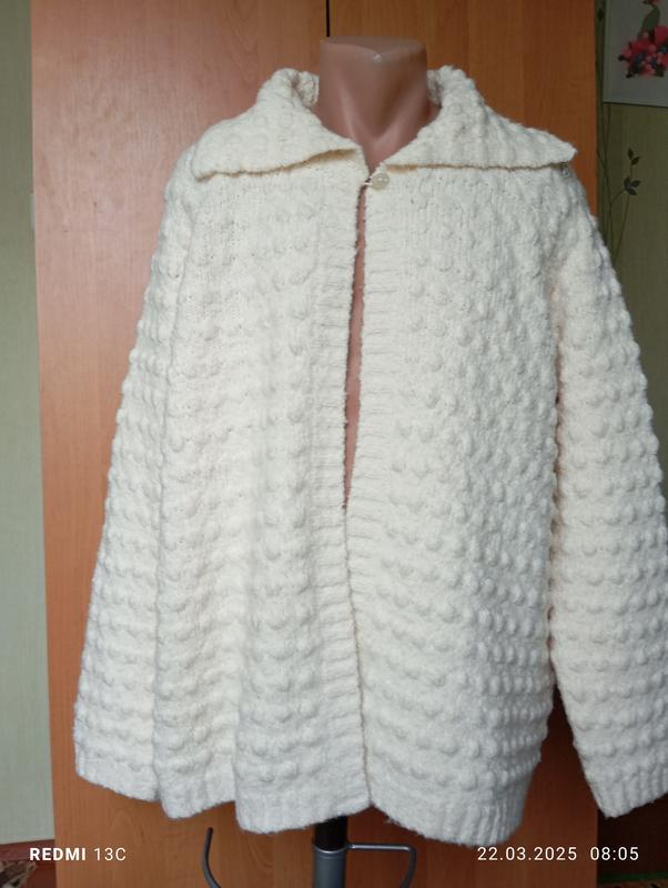 Очень теплый кардиган молочного цвета в отличном состоянии. Подходит как оверсайз и на свой размер до 58.Полуокружность 62, длина 72, рукав от шеи 76.