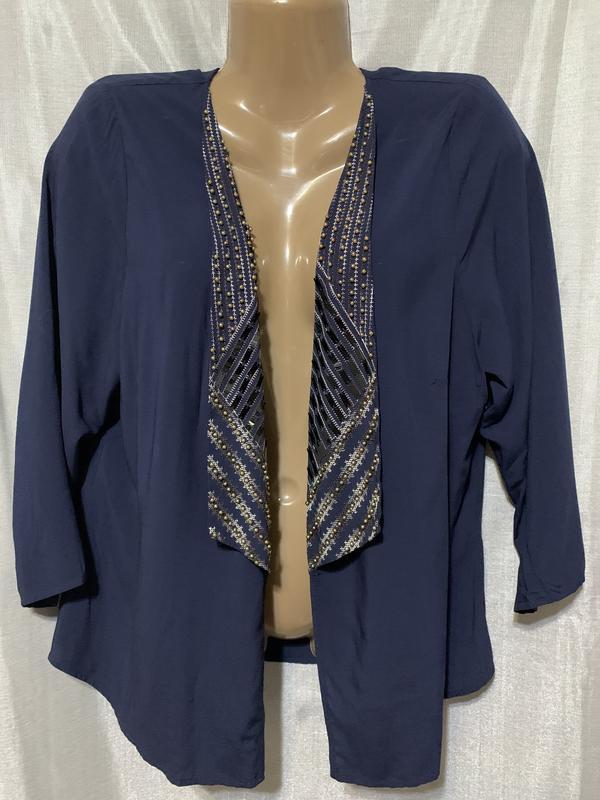 Тонкий жакет без застежки, ворот расшит бисером. Замеры: длина - 64см., рукав - 50см., ПОГ - 55см., ПОТ - 56см., ПОБ - 61см