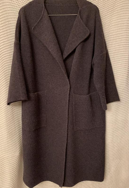 Кардиган - пальто из очень плотного трикотажа, тяжелое. Цвет необычный, с фиолетовым оттенком. Есть следы ношения: с внутренней стороны каташки, нужно пуговица плотнее пришить. Але загалом стан хороший.