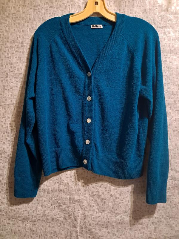 Кардиган вкорочений. Стан нового цвет-бирюзовый (камера не передала цвет). Рукав-реглан. Застежка-на пуговицы. Замеры: Длина по спинке 56 см Длина рукава от воротника 71 см(реглан) ПОГ 60 см ширина по низу (по резинке) 48 см