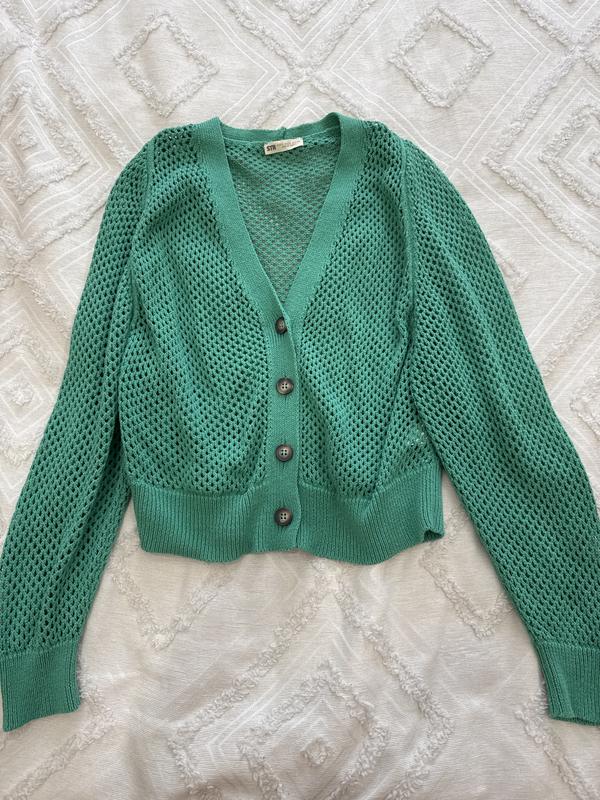 Размер S, состояние нового, одет 1 раз Зеленый свободный кардиган с коричневыми пуговицами – стильный и уютный элемент гардероба для создания комфортных, но модных образов. Его свободный крой придает образу легкость и непринужденность, а коричневые пуговицы добавляют интересную контрастную деталь, подчеркивающую натуральность и тепло цвета.